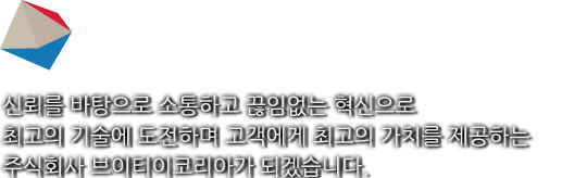 (주)브이티이코리아는“믿음과 신뢰를 바탕으로 고객에게 더 큰 가치를 제공한다” 는 경영이념을 가지고 새로운 도약을 시작합니다.
